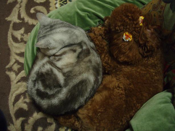 ぼけ〜としている日 今日は雨模様の天気なので特に何もすることなくテレビの前で「ぼけ〜」としていると、私の横で喧嘩仲間の犬と猫が仲良く昼寝をしています。