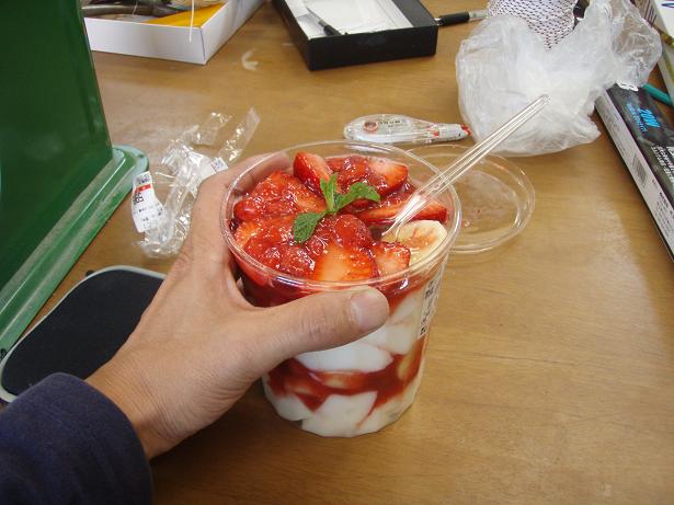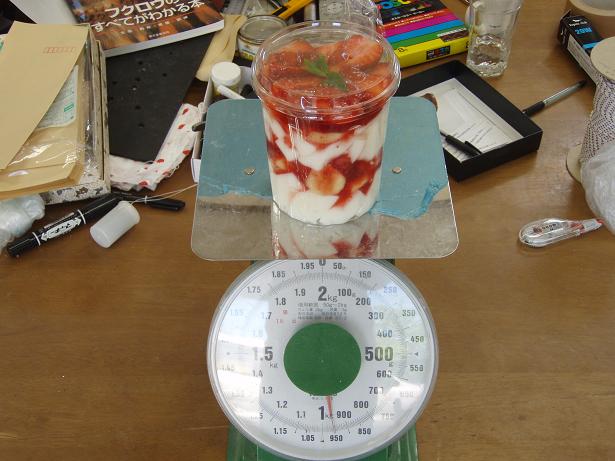 でっかい! 今日は所要により河童へ。昼食のため店外に出たので、ついでに近傍のスーパーで「かみうちの巻」で紹介されていた「杏仁豆腐・大」が食べたくなったので購入し、お店に帰って早速食べる。食べる前に秤で量ってみると、何と!950gオーバー!!写真で見るよりボリュームがあります。