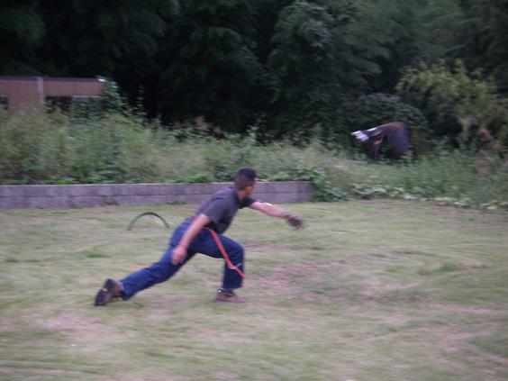 飛ばし込み 本日は朝から時雨を晒し、吉田流の実演を見に行った後に河童でのプチバーベキューに参加し、久しぶりに鷹狩りについての話をする機会を得ました。写真はプチバーベキューの横で時雨の飛ばし込みをした際の1枚です。