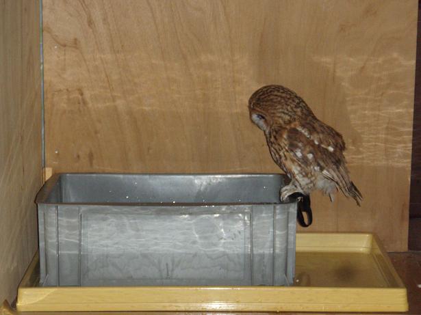 ふくろうU 水浴びをするため、水桶を覗き込んで中に入るか思案している映像です。