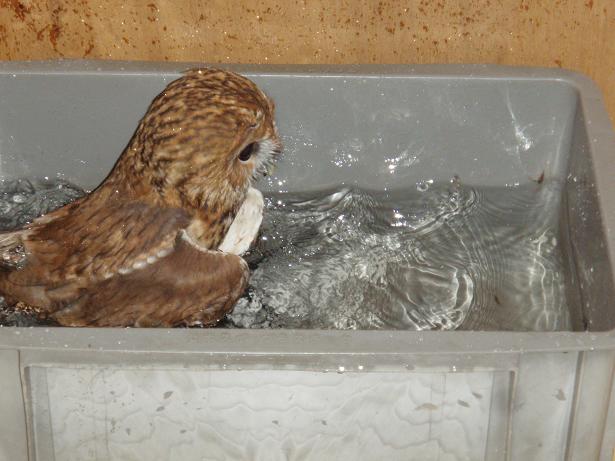 ふくろうV 水桶に飛び込むと、水を飲んでから水浴びを始めます。ふくろうは水浴びが好きなようで、多い時には1日に5回ほど水浴びをすることもありますよ。