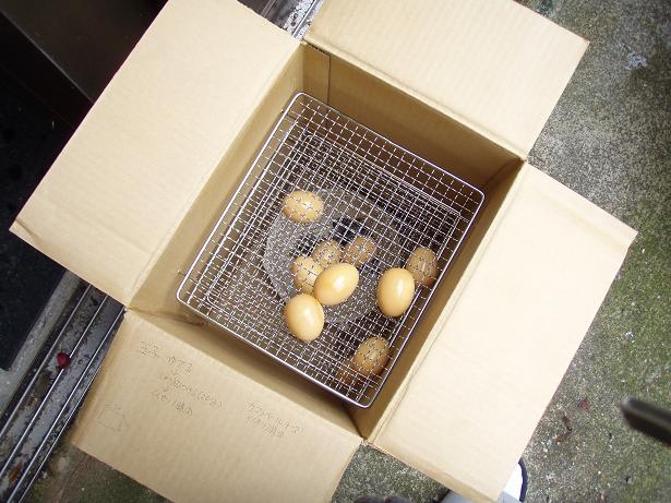 燻製卵を作ってみました 燻製に初挑戦してみました!!廃材のダンボール箱を利用してスモーカーを作りました。中にある金網は100円ショップで購入。あとはスモーク・ブロック(正しい用語か確認していません)と生卵を購入し、手始めに燻製卵を作ってみました。ゆで卵の殻を剥いて、醤油に20分間漬け、乾燥させた後に1時間程燻製にすると出来上がり。結構美味しかったですよ。