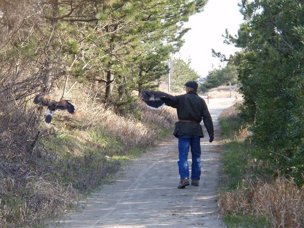 今日も風は強かった 今日も昨日と同じく風の強い中フリーフライトの訓練に出る。まぁ〜私の健康維持を兼ねての訓練と言う方が良いかもしれませんが、1時間ほど散歩をしました。写真は忍が拳に降りるところです。2羽を同時にフリーにした時から感じていたのですが、1羽が先に拳に乗ると、もう1羽は木の枝に留まり自分の番を待っているようで、拳の上での餌の獲り合いは今まで無かったと思います。
