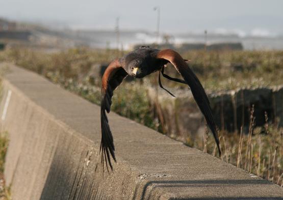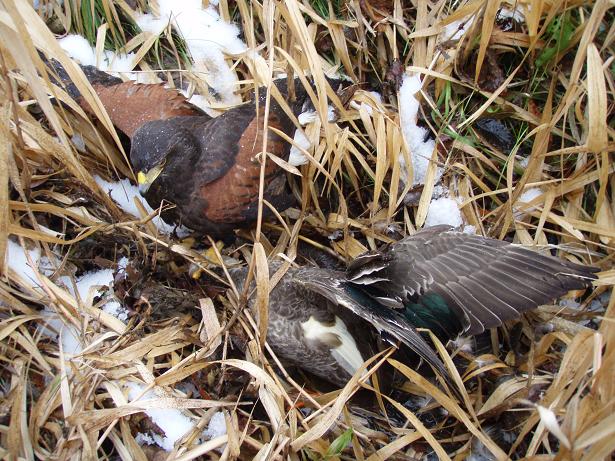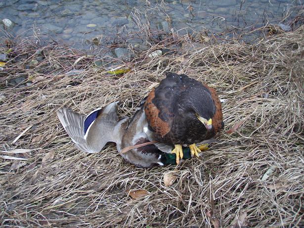 その後、幅の広い川にカルガモに交じってマガモを数羽発見。 慎重に近づいて羽合せ一発!時雨は当初カルガモを追っていたが、低空飛行をしているマガモを確認すると、獲物をマガモに変更して左旋回しマガモに追い付き掴もうとするが失敗、対岸の堤防を蹴っ飛ばして三角飛びの様に反転し、ヨロヨロ飛んでいるマガモに追い付き掴み獲る。 うん、たいへん良くできました。