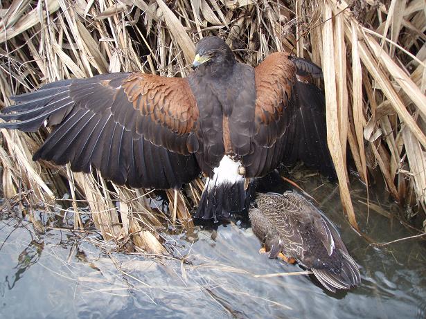 お見事! 朝から猟に出発したが獲物いません。やっと、獲物を見付けて近づいて行くと、私に気付いて飛び立ってしまう。その後、獲物を求めて歩いていると、葦のしげみにカルガモを発見。しかし、葦が邪魔で羽合せが難しい。じっくりと鴨の動きを見て羽合せると、飛び立ったが反転して水中に飛び込もうとする鴨を葦を飛び越えて、降下しながら上から押さえる形で掴み獲る。ん〜お見事!