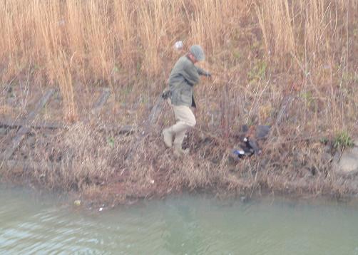 今日は寒かった 今日は神内さんと猟に出る。小雪が時折降る中、カルガモに羽合せると、川の中央に着水し、鴨のお尻を掴んでいたので、鴨が水中を泳いで逃げようとすると時雨が水面でクルクル回りながら下流に流されて行くので、川の中に入り据え上げ完了。