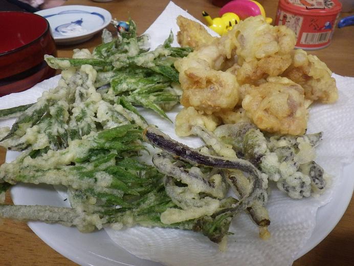 山菜 本日は河童敷地内の山菜で再び天ぷら!たらの芽、ウドの芽、わらび・・・先日の胸焼けを反省し、新しい油で・・・