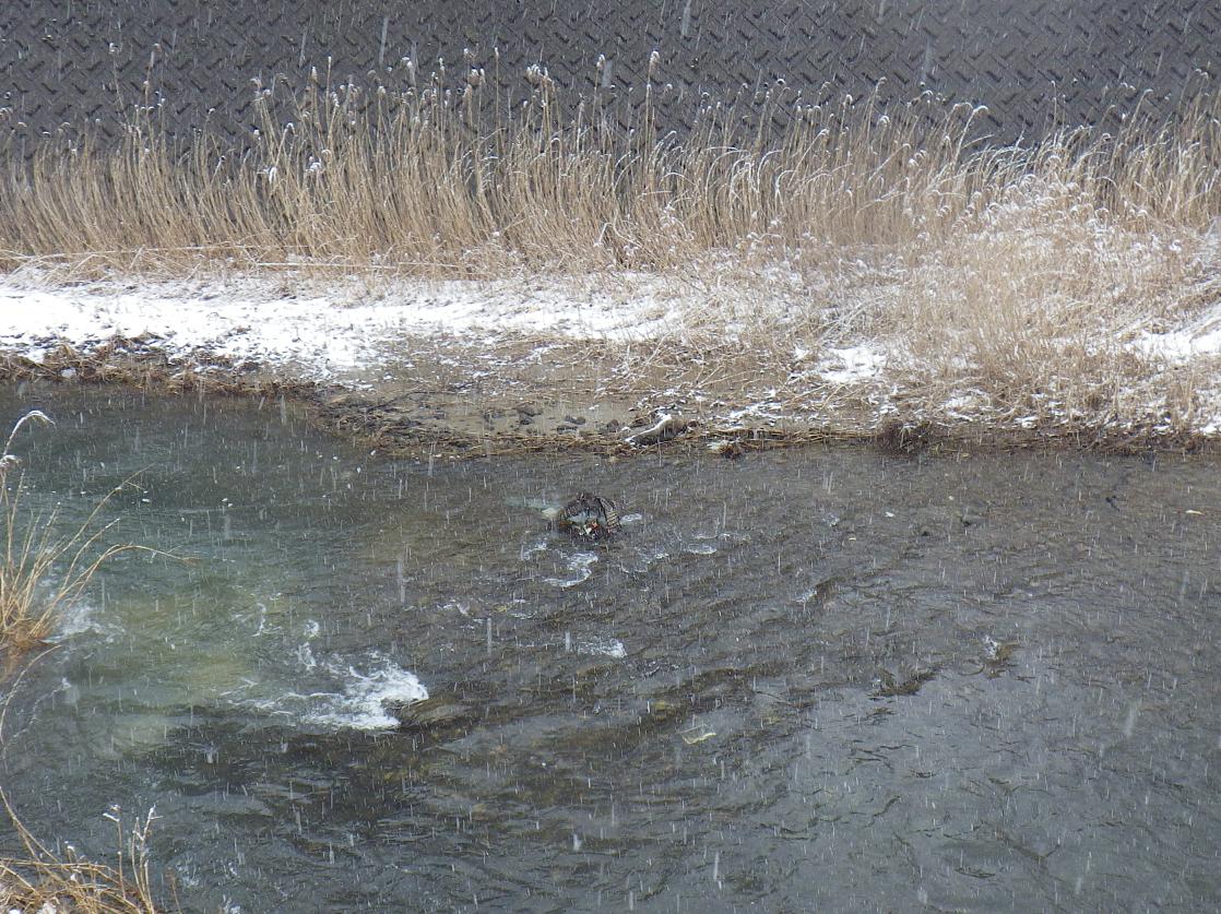実猟研修会・・・参 午前中はカモ類を狙う。池上鷹匠補のGBスパ「うずめ」が、水面に戻ろうとしたカルガモを上から押えるように掴み切る!!