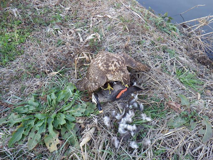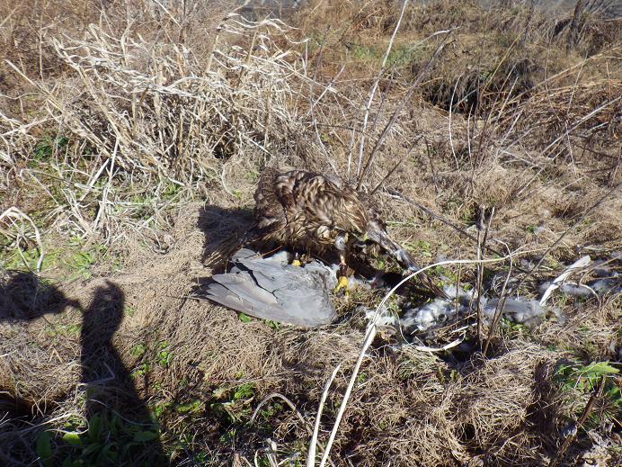 写真は池上会員が振鳩(ルアーでの)を行うシーンです。 池上会員は上手くできましたが、一回目の私はと言うと・・手加減したつもりが、天井にルアーが当り、鷹が取り切れない・・で終わりました。