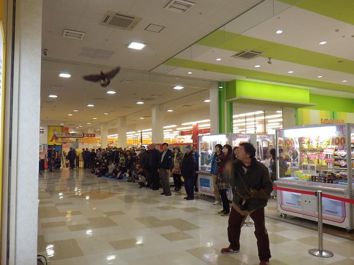一富士、二鷹、三茄子にかけて、今日1月2日は岡崎エルエルタウンで実演を行いました。 様子見で出した蒼海は、いきなりパニックフライト! 一回目の実演でも、蒼海は逸れてショッピングモール内をパニックフライト、黒羽は光るフロアを嫌がり引っ張るルアーには行かないなどなど、多くのトラブルはありましたが、かえってお客さん達には受けたようで、まぁなんとかやり通せました。