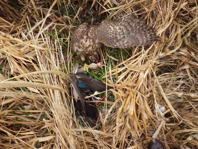 昼前には雨が降り出し、霙へ、そして14時過ぎには雪に・・・ そんな中、飛礫は久しぶりに良い感じで、カルガモを・・・ その後もカルガモを獲ったのですが、こっちはかなり危ない獲り方・・・ それは田んぼの境にネットが張り巡らせている横の川でのことです。棒立ちしたカモに羽合せて、上手く絡んで掴んだのは良いのですが、絡んで落ちる時にネットに接触するような感じでした。 ・・・で、据上げに行くとカルガモのお腹がザックリ切れていました。はじめは飛礫のパワーはすごいな!なんて思っていたんですが、どうも違う!?? よくよく考えると、ネットを立てるために使っている鉄の棒にカルガモが刺さったようです。尖っている訳ではないんですが(1.5cm程度の鉄棒を、ただ切ってあるだけ)、カルガモ自身の重さで切れてしまった様子。
