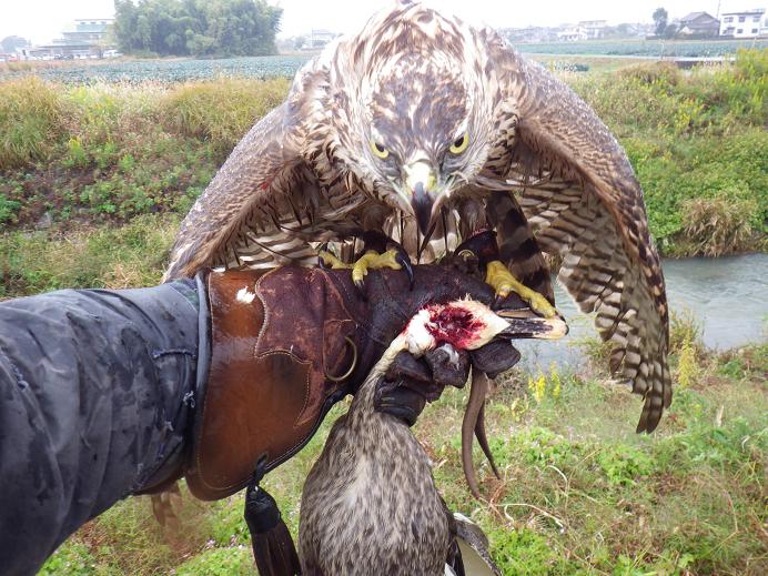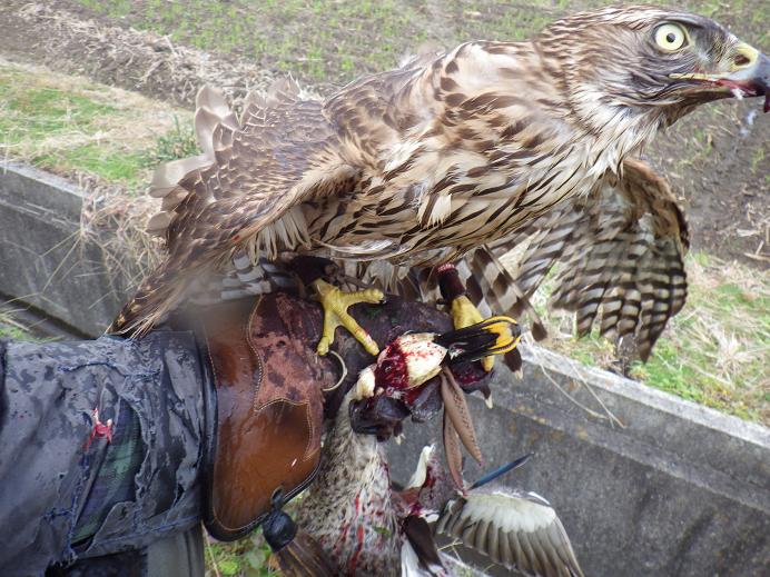 まぁ、頭取りは大きな獲物を楽に押える為に、鷹が覚える技なのですが、「弟鷹/だい」でしかも大きな北欧系では、カルガモくらいなら力技で強引に押さえ込めるということなのだろか? そもそも、先輩諸氏の話からは「兄鷹/しょう」は力が弱いので、頭取りなどはすぐ覚える。しかし弟鷹は、力でねじ伏せれるので、逆に技がないと獲れないウサギなどをやらないと覚えるのに時間が・・・などと教えられている。 もちろん雌雄差以外にも鷹の個性や調教の出来などの要因も加わります。 飛礫はまだまだです。