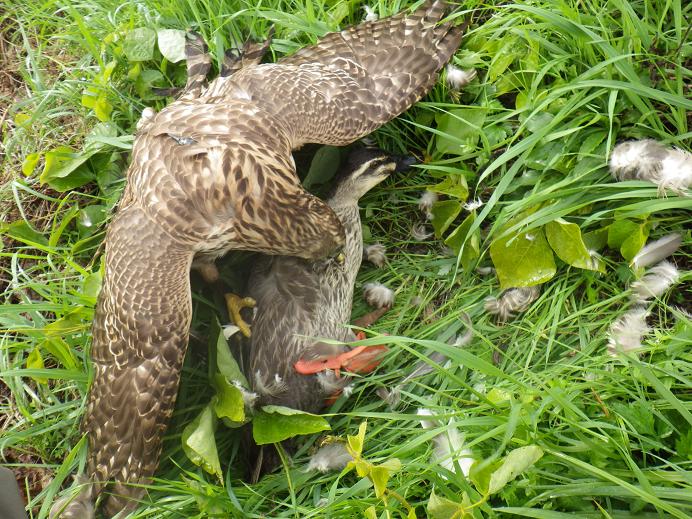 3度目の「羽合せ/あわせ・はわせ」で上手くカルガモを獲る事が出来ました!! まぁ、でも見てもらうと分かるように、「頭取り/かしらどり」は出来ておらず、いろいろやるも力任せ・・・胴体が良い・・・感じで、頭取りするようになるのは時間が掛かるかも・・・・