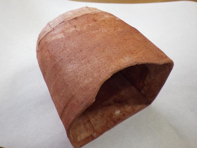 一閑張り・・・2 障子紙で全体が6枚重ねから8枚重ねになったので、布着せを行う。すると少しそれらしい感じに・・・少し厚みも出来てきたが、湿気を帯びフニャフニャなので、しっかり乾燥させることに・・・
