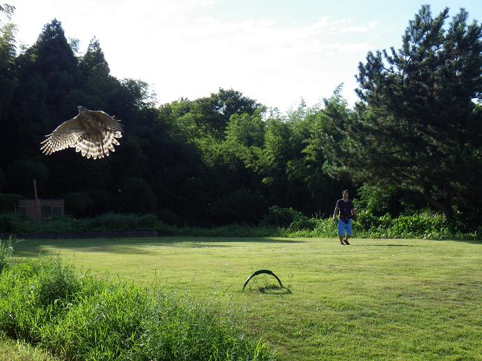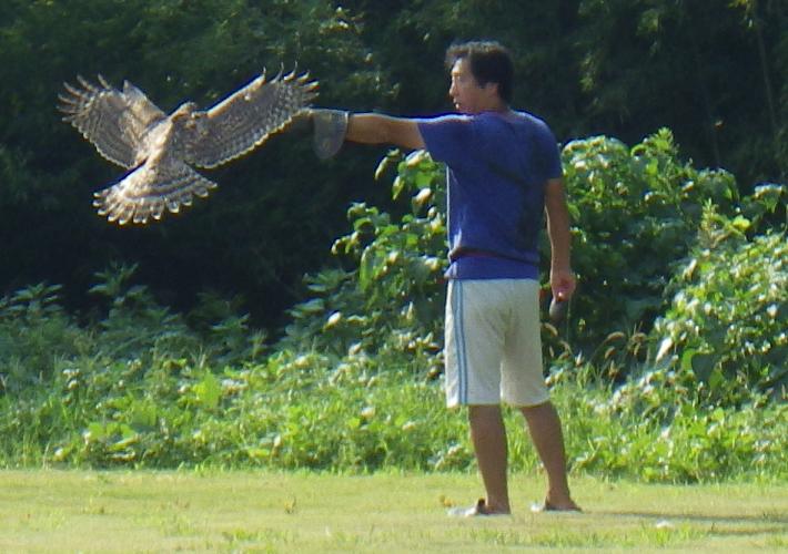 ちなみに諏訪流では、渡りで鷹を呼ぶ時には、鷹のスタートを確認したら、目を背ける格好で鷹が拳に止まるのを待ちます(受ける)。しかし、まだまだ止まるのが下手な上、アグレッションが出て・・・なんて、ことも考えられるので、背中を向けてはいますが、鷹の挙動は見ていなければなりません。 また、餌合子を使う時には、器のみで受けるか、ふたを添えて受けるか・・・によっても、違います。 ふたを添える場合は、事実上半身のような形になります。 まぁ、餌合子のふたも本来は添えないのでしょうが、鷹が出来るまでは、足が出たり、止まり損ねたり・・と、いろいろあるので、そこは臨機応変に対応せねばなりません。 あくまで「良い鷹」を作るため諏訪流放鷹術の教えや型はあり、型にこだわるあまり、鷹の動きや訓練段階を見誤ったり、おろそかにして良い訳ではありません。