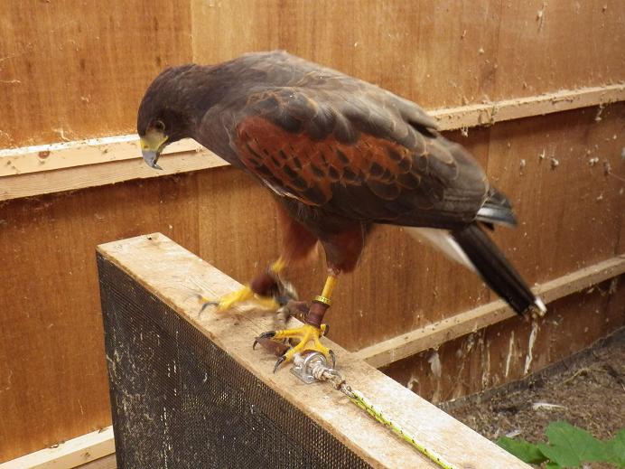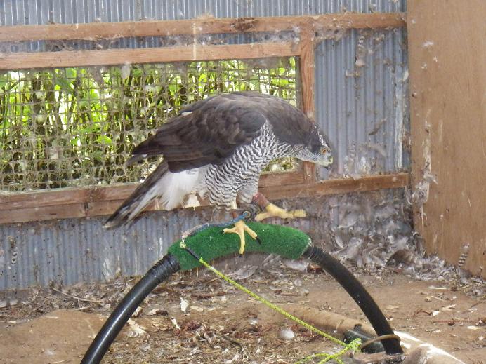 「塒/とや」・・・「鳥屋/とや」とも書きますが、諏訪流では「塒」(ねぐらとも読む)を使います。 羽根の抜け替わり、つまり換羽のことです。 オオタカ等の小〜中型猛禽類は、毎年3〜10月の間に4〜5ヶ月の時間をかけてすべての羽根が抜け替わります。 ストレスがかかっていたり、栄養状態が悪いと「塒が始まらない」「すが入る」等の問題が生じます。 ですが、問題が起きても生理的な問題ですので、後からなにかできるわけではないので、日頃から十分エサを与え、ストレスをかけないようにする・・・と言うことしか出来ません。