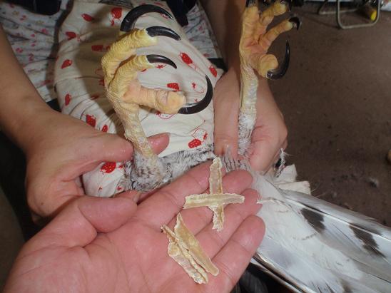 オオタカのあし ロシア産のオオタカのメスの「距蹠/ふしょ」(足革をつける部位)の皮膚がこんなに・・・ウロコ部分が太くなり、浮いているので、慎重にはがすと・・・昼前には井上鷹匠が来店、装束を注文に・・・