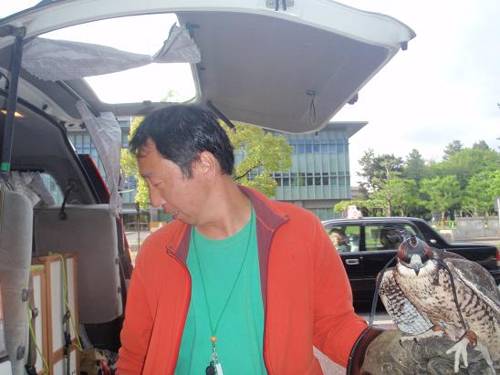 天平祭の為、奈良へ・・・ 天候は、小雨が時々、また風が強く、人工物にしても止まり辛く、木もなにもない広場での、実演のため、ハリスホークでも悪天候と言えるコンディション。 黒羽の反応は微妙・・・ まぁ、こちらは本番ではそこそこ仕事したましたが・・・