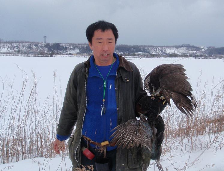 3回目は小さな「篠竹/しのだけ」薮の外にキジが1羽・・・薮にもぐるが、反対側から池上会員にプレッシャーをかけてもらいすかさず2羽のキジ(2羽ともオス)が飛び出す。神滝を羽合わすが、横合いから突っ込みかわされた格好に・・・そのまま追うもかなり放された感じ!!それでも数百メートル追って、葦原に降りたキジにいったん上昇した神滝が鋭く切れ込んで突っ込んだ。すぐに据上げに走る。しかし、またまた雪の邪魔が・・・若干聞こえる鈴を頼りに近づくと、2羽のキジは飛んでしまった。それを神滝は地面からのリスタートで追う。しかし、なんでか1羽のキジは数十メートルで降りてしまい、そこへ捻り込むように神滝。その後は、またまた地上戦・・・キジも神滝も休み休み・・・最期は用水にキジが飛び込み、神滝もそのまま突っ込み水中戦で掴み切りました。 薮の反対で見ていた、田中鷹匠、福沢鷹匠補、小松会員の話だと「2回目の突っ込みで、キジを掴んでいたが、その後に放された」とのこと・・・やはり、身寄りの「鳥搦/とりがらみ」が半分無いのやあちこちの怪我のせいかなぁ・・・!?