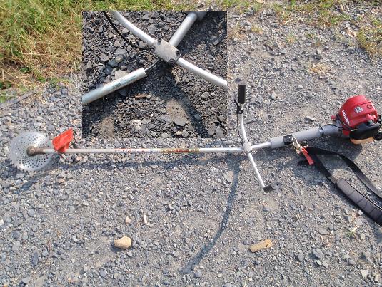 ブキン 朝からがんばって草刈を始めたのですが、ストック場の半分くらいまで進むと、突然「ブキン!」という音とともに刃の回転が止まりました。さらに手応えが・・・よく見ると手元からシャフトがポッキリ!!「また、要らん出費が・・・」