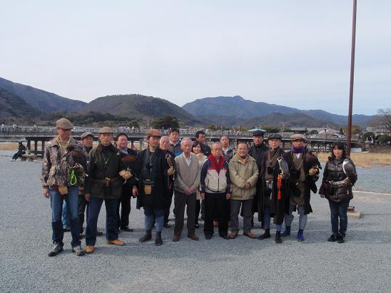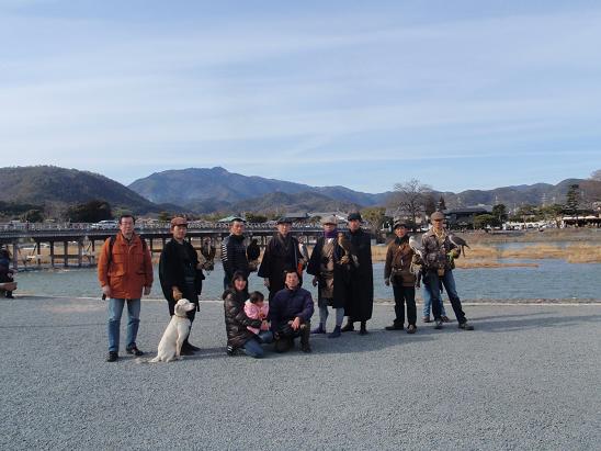 まずは中ノ島に車を止めて準備。その後は鷹を据えて全員で、渡月橋を渡り、楓の木の前で記念撮影・・・ 再度、中ノ島まで戻り、実演を始めました。 このとき福沢鷹匠補は、渡月橋の真ん中へ・・川の真ん中辺りから、ハリスホークの雫を振鳩(ルアー)にて呼んでスタート・・・ その後はハリスホークでの振替、渡り、振鳩(ルアー)・・・ その後は遠藤鷹匠のアフリカンラナー 弟によるルアーリング・・・ そして神滝の振替と振鳩(ルアー)・・・ 最後に再び渡月橋から雫を振鳩(ルアー)で呼んで終了!!