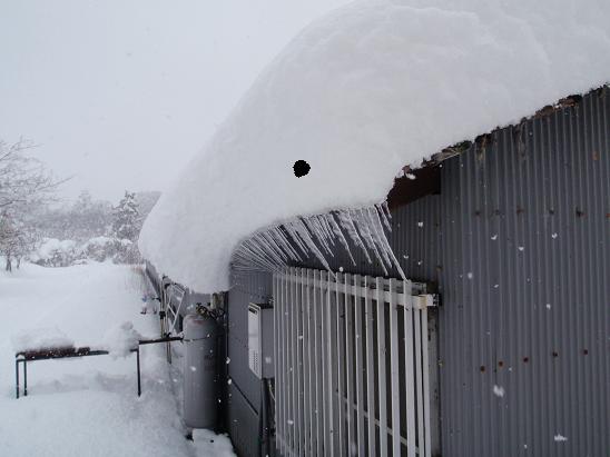 トタン屋根で雪が滑り、ズルズル落ちるので、ツララが斜めに・・・