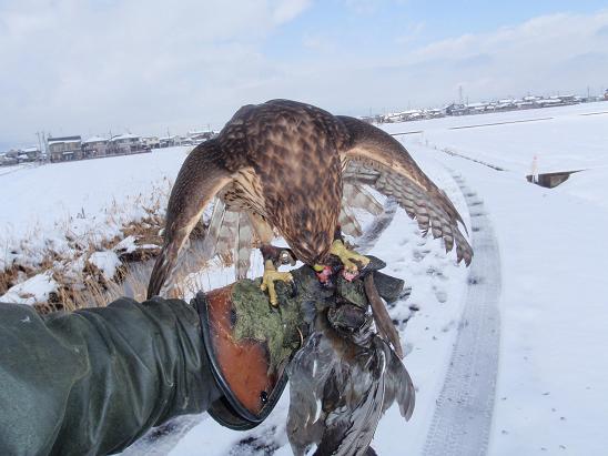 吉田会員は、すぐ近くの用水脇でバンを狙うも道路際だったせいもあり、追いが甘い。その後電柱に上がり、渡りで呼ぶも、キジバト見込んでスタート・・・このキジバトはバンを狙う前か私達は見つけていて、なんか獲れそうな感じ(動きが変)だったのでバンにするかキジバトに明日か悩んだ鳥・・・そのまま上から絡みつき、いったん掴み直して獲っちゃいました。でも、やはりこの大雪のせいでしょうか!?痩せていたようです。