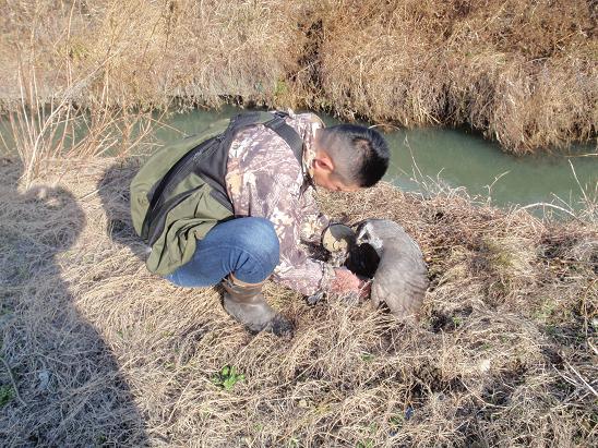 ゴイサギ 昼前に井上鷹匠補が来店!その後は今期(猟期)2度目の昼食をとり、狩りがてら訓練へ・・・井上鷹匠補宅周りはゴイサギがほとんど居ないため、当てたことがない・・・そうです。せっかくなので、探してみました。細い用水で直ぐに1羽を発見!!当ててもらいましたが、私は用水に落ちた時用に網を用意・・・振り返ると、ちょうど出すところで、追い回して獲り切る所が見れました。もちろん用意していた網を持ってダッシュ!!夕方には河童近くで渡りなどを・・・・