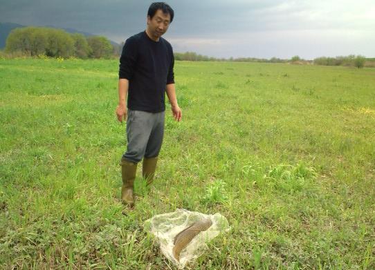 11日深夜から降り続いた雨のせいで揖斐川は増水! 河川敷まで水が来ていました。本日は買い物ついでに橋を渡ったんですが、河川敷の牧草地に大きな水溜りがあり、そこへカルガモやウが入っています。なんとなくその水溜りを見ていると、明らかに大きめの魚の背びれが・・・ 買い物を済ませ、帰り道に覗いても、やはり居る!しかし、干上がるのを待つアオサギも抜け目なく・・・