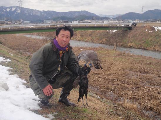 遠藤鷹匠&ホワイティ、福沢鷹匠補と狩りに出る。先週、実猟研修会で福沢鷹匠補に案内してもらった場所です。白波は水鳥系はいまひとつなのでキジ狙い!と言っても、まだまだ「飛び」は遅く、「結果が出せる?」ってな感じ!! それでも、ホワイティの出したキジを追い河川敷を行ったり来たり!!3回目の追い返しなので、良い感じとは到底言えませんが、なんとか獲りきる事ができました。 その後は福沢鷹匠補&雫で、キジ・カモを狙いましたが、良い結果は出せませんでした。