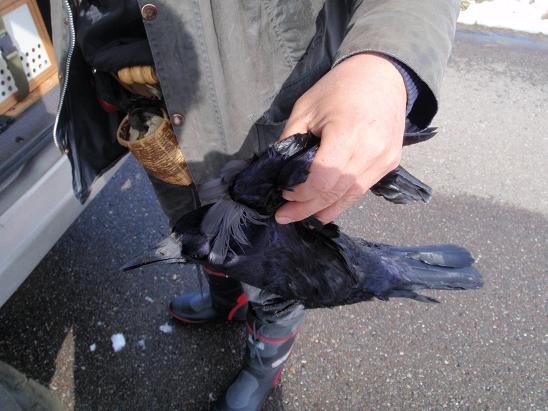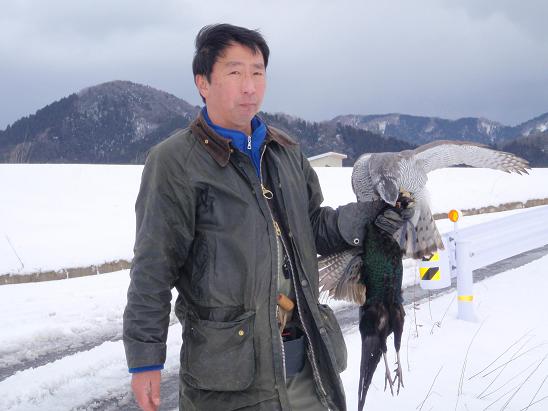 3箇所目では車を止めた直ぐ脇にオスキジが見えたので、白波を据えて近づき、飛び出したところへ羽合せ!!そのまま200m程追い民家の裏でドタバタ!さらにキジが飛び出し、白波がついて行く。キジを見失い。白波は道路脇の手すりに止まっている。直ぐに据上げて、反対側で見ていた福沢鷹匠補が「あそこに入った」と言う土手下の民家の裏藪を見ているとキジが動いたので、白波を行かせる。その後はまたドタバタ、・で獲り切れずに、民家の軒先に止まる。土手を降りてキジを探そうと、近づくとキジが動き、白波が突っ込む!またドタバタ!!しかし、逃げ道がなくなったキジをそのまま掴み切った!!!