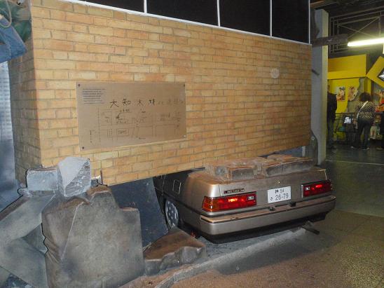 阪神淡路大震災 7/13 地学のコーナーの地震の展示物に神戸のスーパーマーケットが・・・醤油や味噌も並んでいました。これは建築屋の駐車場で車がつぶれています。博物館ですので、標本とレプリカの展示です。標本などはまぁ・・って言うのもありますが、すごい良い出来のものも・・・