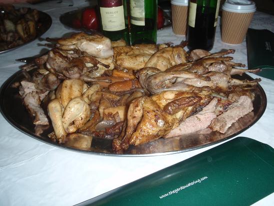 宴会・・・3 7/11 パートリッジ&ウズラ(パートリッジの若鳥かも?)とラム肉のオーブン焼き。とにかく肉がないと始まらない!?とのこと・・・味付けはシンプルで、塩気が足らない。塩と胡椒は別付けで付いてはいるんですが・・・足りない!・・・レモンとかあれば最高なんだけど・・・