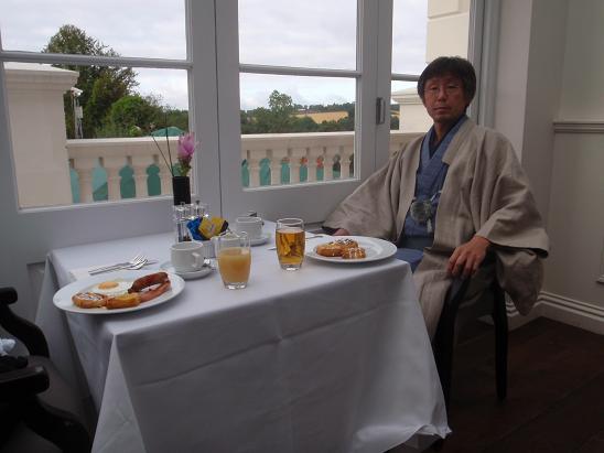 モーニング 7/12 朝はいつもバイキングでこんな感じ。コーヒー・紅茶・ミルク・ジュース各種、ソーセージ&ベーコン、目玉焼き、パン、シリアル、フルーツ、ヨーグルト等・・・フランスと違いチーズはない。