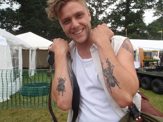 タトゥー 7/11 タトゥーを入れた人は結構多い。この人なんかはヨーロッパミヤマクワガタのペアと思われるタトゥーを・・・もちろん肩とかにも入ってるのが見えます。