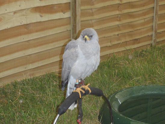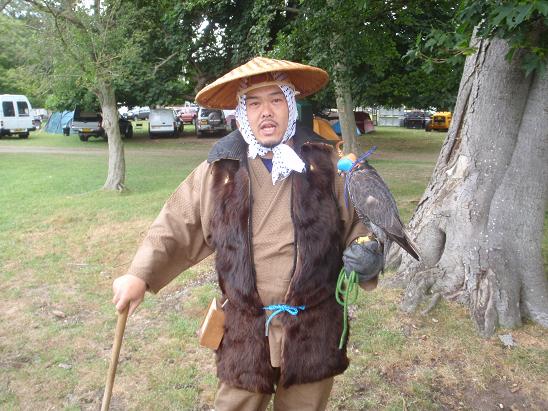 クマタカじゃあねぇし・・・ 7/11 東北のマタギのクマタカを使った鷹狩りの衣装をまとう猛禽屋の藤田氏。松○氏から借りたものだ。クマタカを貸してくれる訳も無く、ハヤブサで・・・しかし、良く似合う。※午後はイヌワシ、最終日はワシノスリを借りる事が出来ました。