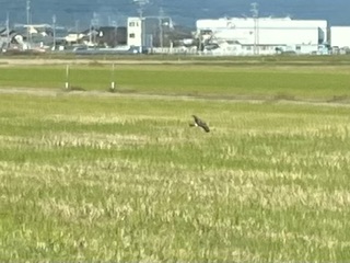 ハイイロチュウヒ!? 腰が白いのでハイイロチュウヒのメスかと・・・・時期的に早いような!?色が黒い子?なので、まるでハリスホークのように見える。