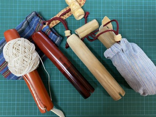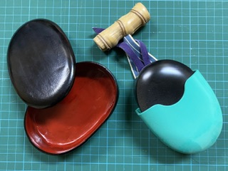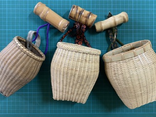 右が「忍縄袋」に入った状態の、竹を削っただけの普段使いしている「忍縄筒」と「忍縄」 右から二つ目が同じく竹を削っただけの「忍縄筒」 左から二つ目は漆を塗った「忍縄筒」 左が「忍縄袋」の上に、漆を塗った「忍縄筒」と「忍縄」