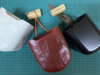 右はイマジネーション藤枝さんが製品化した樹脂製の物です。 真ん中は一閑張で作った物で漆塗りです。 左は一閑張で作ってあり、今後漆を塗る・・・・予定?の物です。