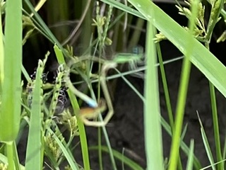 ピンボケ 河童の周辺で、鉄の散歩、鷹の調教などでよく見かけるイトトンポの仲間。子供の頃にはよく見たんですが、その後はあまり気に留めることはなかった。ですが、最近目に留まります。種選別まではしてませんが・・・今日もGGBを調教していると、田んぼでイトトンボがいました。写真を撮るも、残念ながらピンボケ!難しいですね!