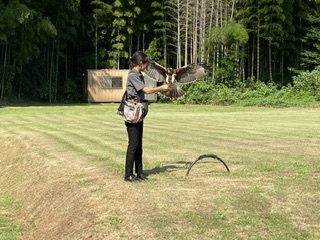 リング抜けてねぇ〜!? 昨日入れた個体識別用のリング(足環)ですが、大きめの2羽は良い感じ(キツすぎず、抜けそうにない)でしたが、小さめのヒナのは抜けてそうだったので、気にしていました。ペアレントレアードなので、何度も入りたくないし、でも気になるし、抜ければ再度入れる、外れたのを探す、なければ別の、入らなければ大きめの・・・と、いろいろ気を使う。で、今朝覗いてみました。 「リング抜けてねぇ!!」三輪会員、ハリスホークのトレーニング中!