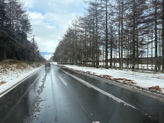 鳩を受け取りに遠出! 行きの山越えは昼過ぎ(13時頃)で、こんな感じ! 雪はありますが、ほぼ解けて濡れているだけです。 しかし、鳩を受け取り17時過ぎに通る時にはアイスバーン!! 雪も降ったみたい。
