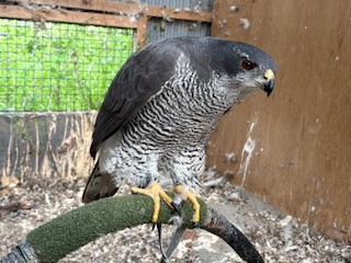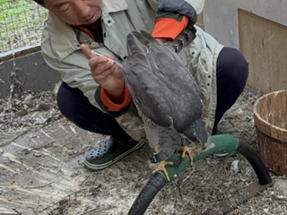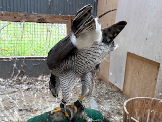 波多野鷹師から引き継いで繁殖していたアフリカンブラックスパロウホーク(アフリカシロクロオオタカ/オオハイタカ)のメス「惣姫/ものひめ」の忘れ形見であるGBです。 大柄なオスだと思い込み、少しいじって繁殖用にと残した子で、良く慣れてる風だったので「オスのGBでも精子採れそう!?」と思っていました。 オスのGBは過去精子が採れたのは「刹那/せつな」(薺の兄鷹でおそらく世界初のGB)だけで、それも少量で一年だけ・・・他でも聞いたことがない。 ブラックスパも含めGBは精子が採れないと言うイメージ。 ※情報あれば教えてください。 またこの子はヒナの時に脛部分を骨折していて、見た目はほぼ真っ直ぐ繋がっていますが、触ると継ぎ目がわかります。 波多野鷹師が来店した際に「この足は弟(だい)じゃん!」と指摘を受け、それからはメスにしか見えなくなった個体でもあります。