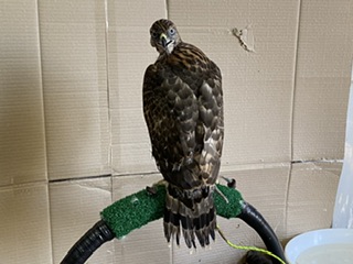 のらんし 弟鷹はいつまでたってもボウパーチに止まりません。水槽の縁には上がっていたので、理解すれば止まるかと思い、とりあえずパッと止まらせちゃいました。で、ついでに曲がっていた尾羽の先も治しました。止まらせてからは、ずっと降りずに止まっています。 「うーん!?」