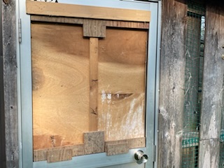応急処置 閉めようとした鳥小屋のドアが昨日の強風で持ってかれて、上部のガラスが割れてしまいました。廊下ではあるのですが、卵を抱いている鳥もいるので、とりあえずビニール袋と養生テープで目隠し!ガラスで手は切るし・・最悪!!板などを張り付けようにもテープでは強度が・・・気をつけて出入りすれば、鳥が逃げることはないのですが、とは言え・・そう言う時ほどトラブルが起きるもの。いろいろ考えて、今日なんとか有り合わせの材料で・・・・