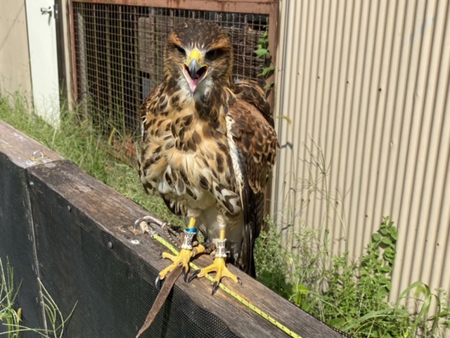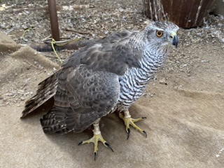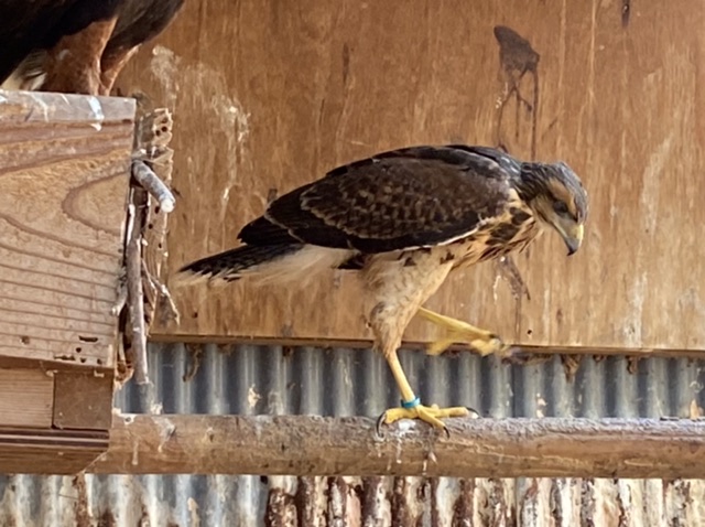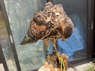 朝、鳥達(鳥の状態を目視で観察)&小屋の点検するんですが、ヒナを育てている南米産ハリスホークを見ると、ヒナが1羽見当たらない。 小屋の隅にうずくまっているのかと四隅を見て、さらに床を見回しても、居ない。 ?さらに良く見回すと風通し用に開けてある窓・・・かなり低い位置なので、外は雑草・・・上に伸びて屋根のように覆っているので、下の方は葉がなく枯れてるのもあり林の中のようで暗い。 その背景に溶け込んで、ヒナの背面があった。 木枠からわずかにはみ出して(5mmほど)いるトリカルネットの一本に、識別用の足環が引っ掛かり宙吊りになっている。