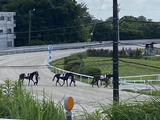 馬に止められる 仕入れで出たんですが、いつもの堤防道路・・・競馬場の横で、先行車らが止まってる!どうやら馬が横断中!!何度も通った道ですが、馬に止められるのは初めてです!!!