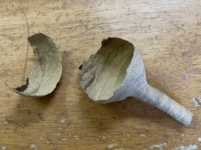 またか!! 繁殖小屋の通路を行って戻って振り返るとらスズメバチがウロウロ飛んでいるのを見つける。もしかしてと目を凝らすとやっぱり巣がありました!!いつも鳥の方へ目線を向けているので、頭の上にこんなに成長するまで気かつきませんでした。まだ女王だけのようでしたので、外へ出た隙に落としちゃいました!!中には一段目があり卵もあったようです。2年前にも作られましたが、ほぼ同じ時期・・・