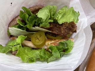 スパイシーにくにくにくバーガー バーベキューの準備で買い出しに・・・・昼飯は下チビ達も居るので、ホントはラ◯ーのたこ焼き・・・の予定が「1時間待ち」と言うこともありで・・・モ◯バーガーが近くにあり、また気になっていた毎月29日限定の「にくにくにくバーガー」の日と言うことを思い出し、贅沢だけど行ってみることに・・・ 「これは美味い・・・」と、思うが贅沢過ぎる!!んでもってビールが必要!!