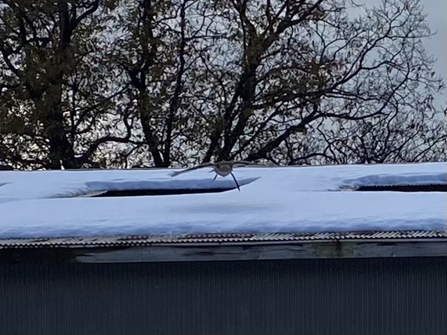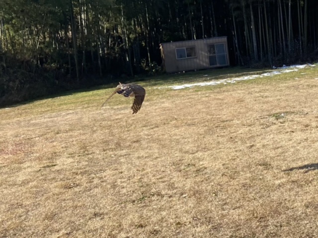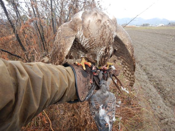 藪際の田んぼにキジが居るのを発見! オス1羽だと思ったんですが、よく見るともう1羽オスが居た。 さらに藪の中にキジバトが居るのはわかったんですが、そっちは当然無視して・・・因もちゃんとキジを見込んでいるので、そのまま羽合せ! 手前の1羽は右に飛び出してぶっ飛びましたが、奥のもう1羽は横の藪に駆け込んだ。 藪は低木混じりで、高い木でも4mあるかないか、因は7〜8m急上昇して、藪に突っ込んだ! 藪の中は、枯れてるし、先日の雪で潰れてスカスカです。